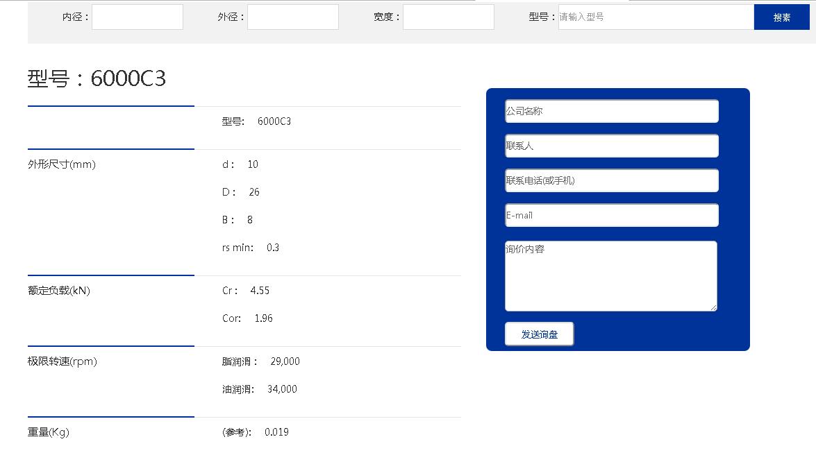 进入产品中心可以看到产品的6大分类,以及详细的文字介绍。进入单个的产品中心,可以通过搜索内径,外径,厚度或者完整的型号搜索需要的参数。